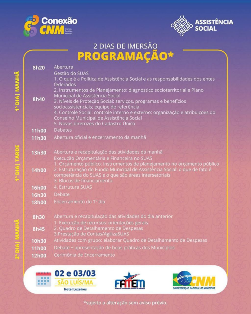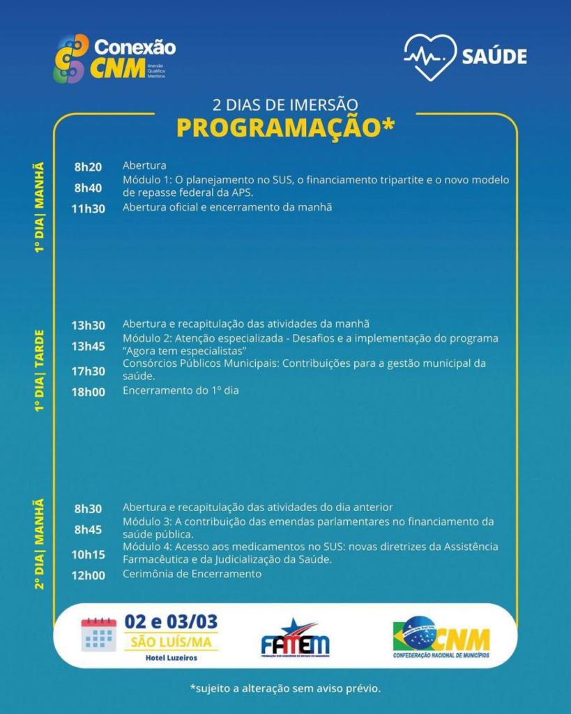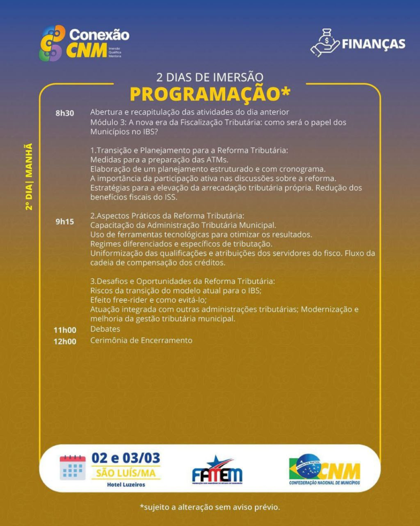 A Confederação Nacional de Municípios (CNM), com o apoio institucional da Federação dos Municípios do Estado do Maranhão (FAMEM), estará realizando o evento Conexão CNM em São Luís/MA, que ocorrerá nos dias 02 e 03 de março, no Hotel Luzeiros.