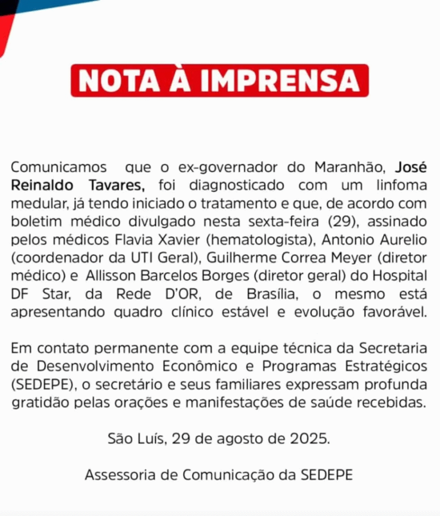 O Governo do Maranhão anunciou nesta sexta-feira (29), que o secretário de Desenvolvimento Econômico e Programas Estratégicos, José Reinaldo Tavares, de 85 anos, foi diagnosticado com um linfoma medular.